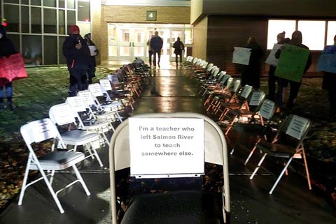 On a frigid and rainy evening near the Canadian border, more than 100 teachers, retirees, community members and parents marched outside an emergency meeting of the Salmon River Board of Education this week. There were also 35 empty folding chairs, each bearing a sign that read: “I’m a teacher who left Salmon River to teach somewhere else.”